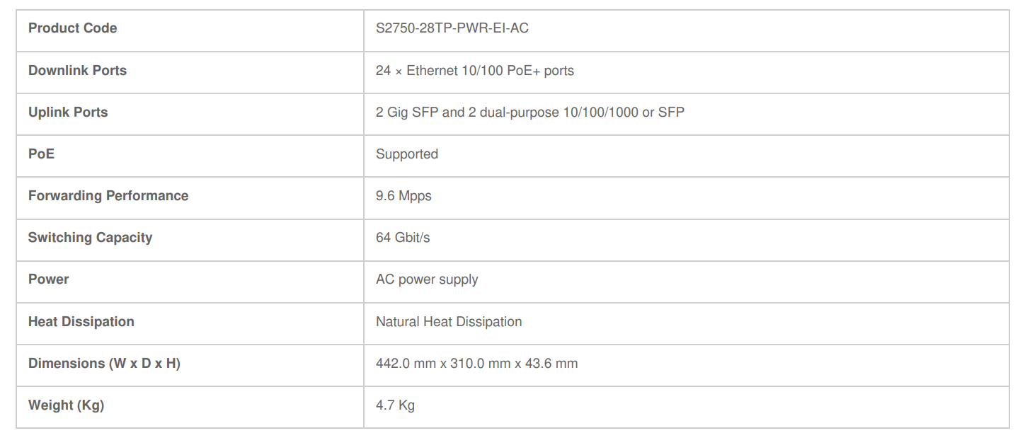 S2750-28TP-PWR-EI-AC(24 Ethernet 10/100 PoE+ ports,2 Gig SFP and 2 dual-purpose 10/100/1000 or SFP,AC 110/220V)